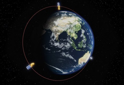The DMC constellation is a group of 3 small satellites placed in orbit 120 degrees apart, as shown in the image above. The idea is to quickly image areas which have been struck by disaster with high-resolution cameras (1 m resolution) with a capability to provide very fast down link in order to help make the images available quickly in order to assess damage and plan disaster response.