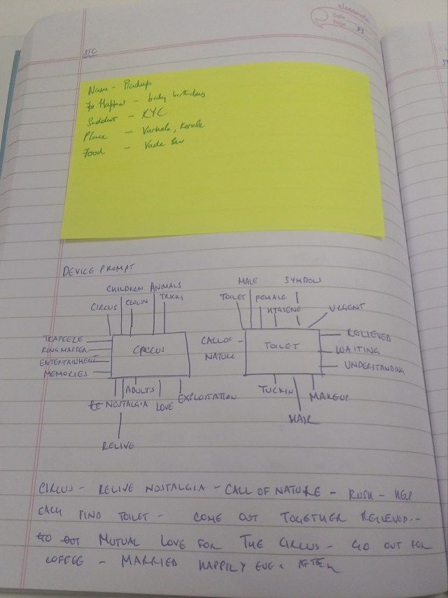 The third session used device prompts. We were divided into teams of six. We were given photographs as device prompts. We were given two photographs – one of a circus and another of a toilet sign. We were asked to prepare mind maps like we had for the second session. We were then asked to outline a story based on the same.